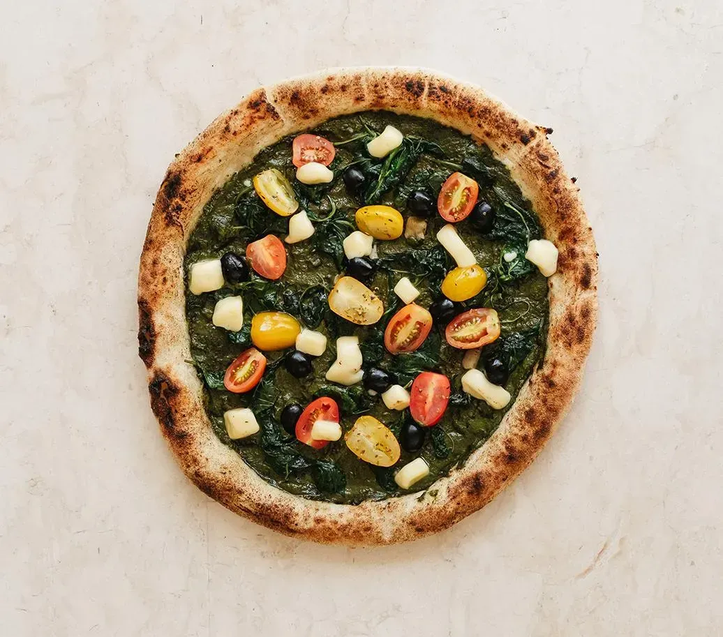 Pesto, basic olives, sauteed spinach, mozzarella, cheery tomato, feta