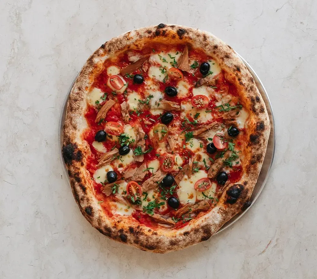 tomato sauce, mozzarella, tuna chunks black olives, cherry tomatoes, olive oil