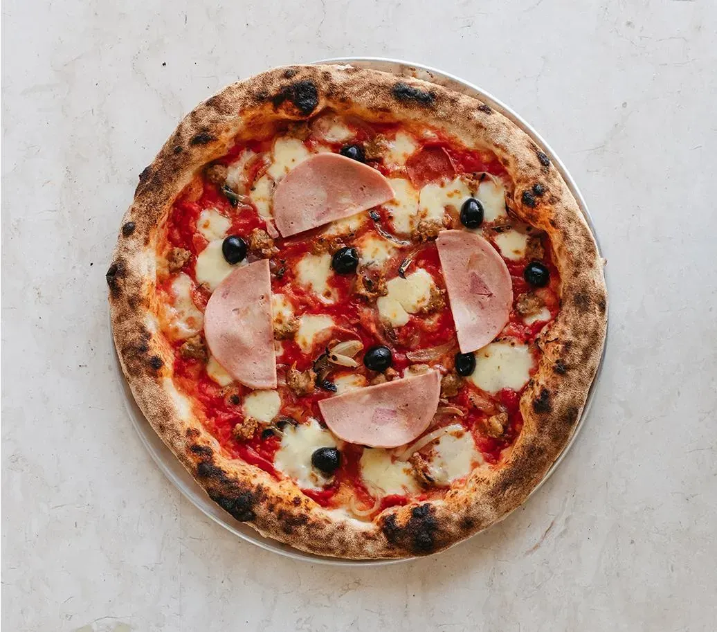 tomato sauce, roasted onion, mozzarella, beef pepperoni, nduja, black olives