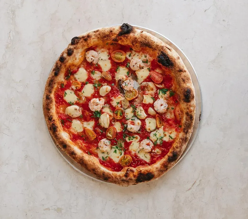 Marinated prawns, Mozzarella, Confit garlic, Cherry tomato, Oregano