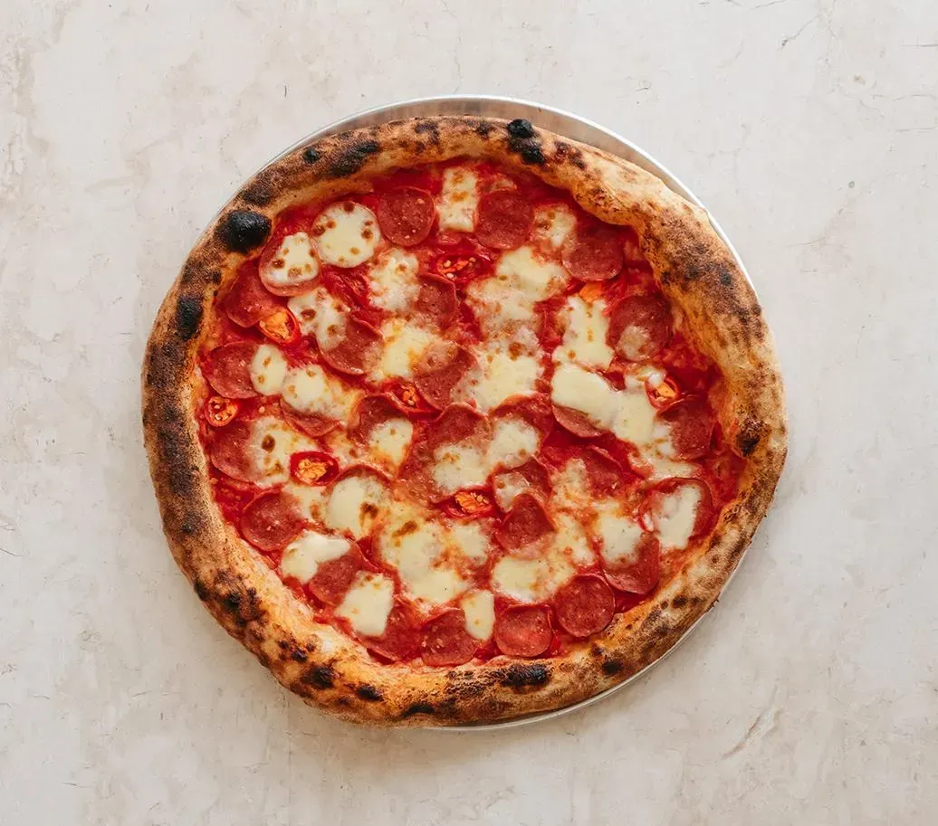 tomato sauce, beef pepperoni, fresh chilli, mozzarella